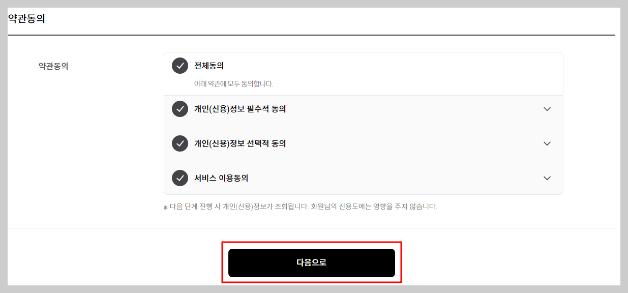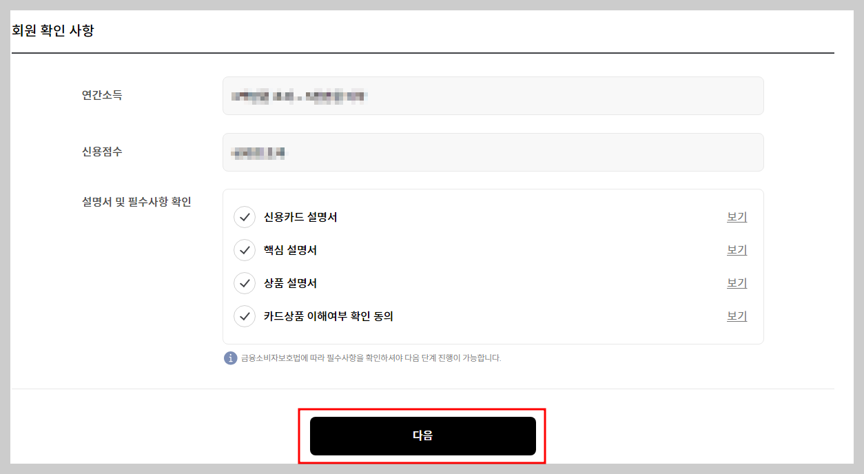 - 개인 정보 확인 : 연간소득과 신용점수를 입력하고 약관동의 후 신분증을 통한 인증을 진행합니다.