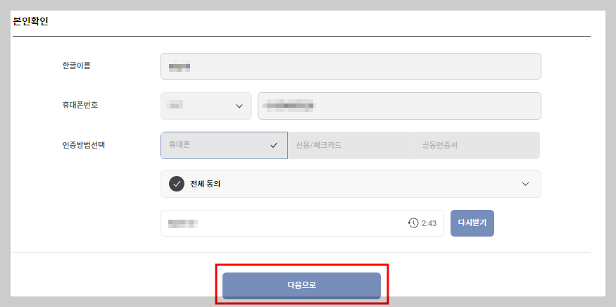 - 본인 확인 : 본인확인을 위해 이름, 주민등록번호, 휴대폰번호를 입력합니다.