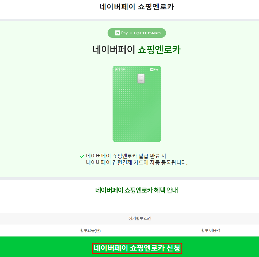 - 카드 신청 시작 : 롯데카드의 네이버페이 쇼핑엔로카 페이지에서 카드 혜택과 연회비 등을 확인하고 [카드 신청]을 클릭합니다.