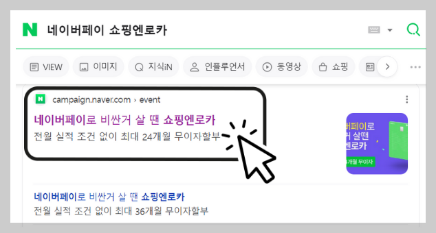 - 검색으로 바로가기 : 네이버 검색창에 [네이버페이 쇼핑엔로카]를 입력하여 네이버페이의 쇼핑엔로카 링크로 들어갑니다.