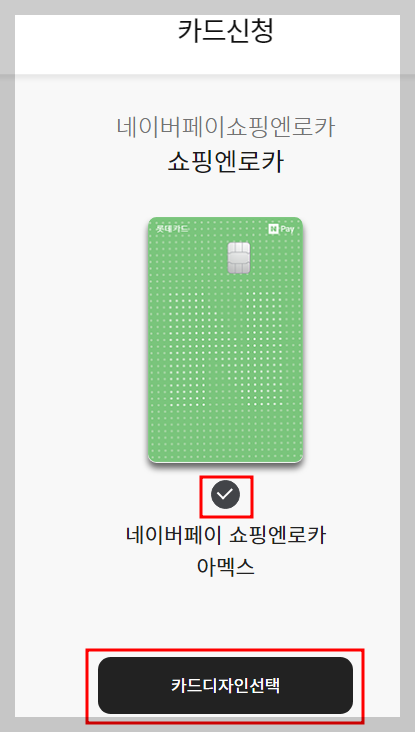 - 디자인 선택 : 카드디자인 페이지에서 '네이버페이 쇼핑엔로카 아멕스를 선택하고 '[카드 디자인 선택] 버튼을 누릅니다.